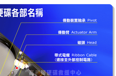 硬碟修復2. 磁頭組, 表面上看來像一個夾子, 夾在碟面上, 其實不然, 在運作時候是飄在磁片上的並無接觸到磁片, 磁頭是硬碟最易損壞